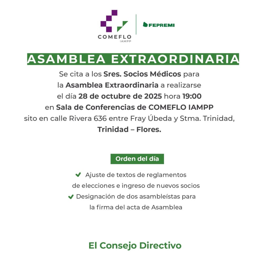 13 de octubre de 2025 Convocatoria oficial a Asamblea ExtraordinariaInvitamos a los socios médicos a participar de este espacio institucional clave para el futuro de COMEFLO.